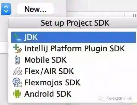 一开始的时候,Project SDK的位置是空的,需要点击右侧的New按钮,然后弹出如下图的下拉菜单,选择JDK,然后选择你所安装的JDK的位置: