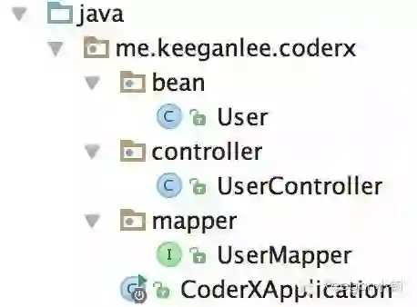 然后,我在 me.keeganlee.coderx 包下新建了 bean、mapper 和 controller 三个包,分别用于存放实体、实体映射和控制器。在 bean 包中新建了一个 User 类,对应数据库的User表结构;在 mapper 包中新建了 UserMapper 接口,方法映射为对User表的操作;在 controller 包中新建了 UserController 类,实现对外的Request API。