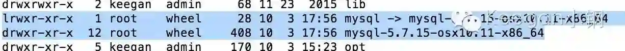 而MySQL的安装位置在 /usr/local/ 下,一个类似于“mysql-5.7.15-osx10.11-x86_64”这样的目录就是安装后的目录,另外还存在一个名为“mysql”的快捷方式: