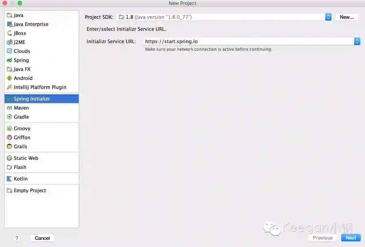 打开IDEA,新建一个项目,左侧菜单选择 Spring Initializr,如下图: