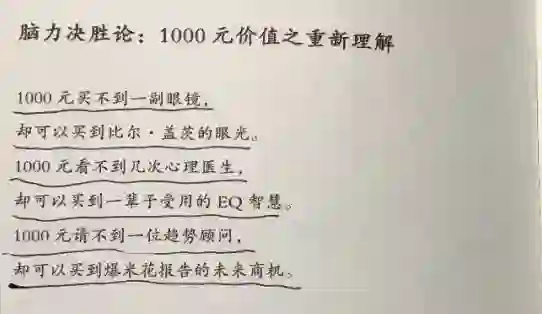 比如,在《脑力决胜论》,李欣频就巧妙的把产品精神利益变成参照物。实物的高价,对比获取精神补给的廉价,强烈的反差对比出要推销的书的价值。