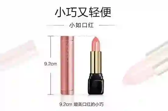 你看,用口红!这个问题直接用一张口红的参照图就解决了,非常直观形象,看的人都知道了这个迷你充电宝好小啊,竟然和口红差不多大小。