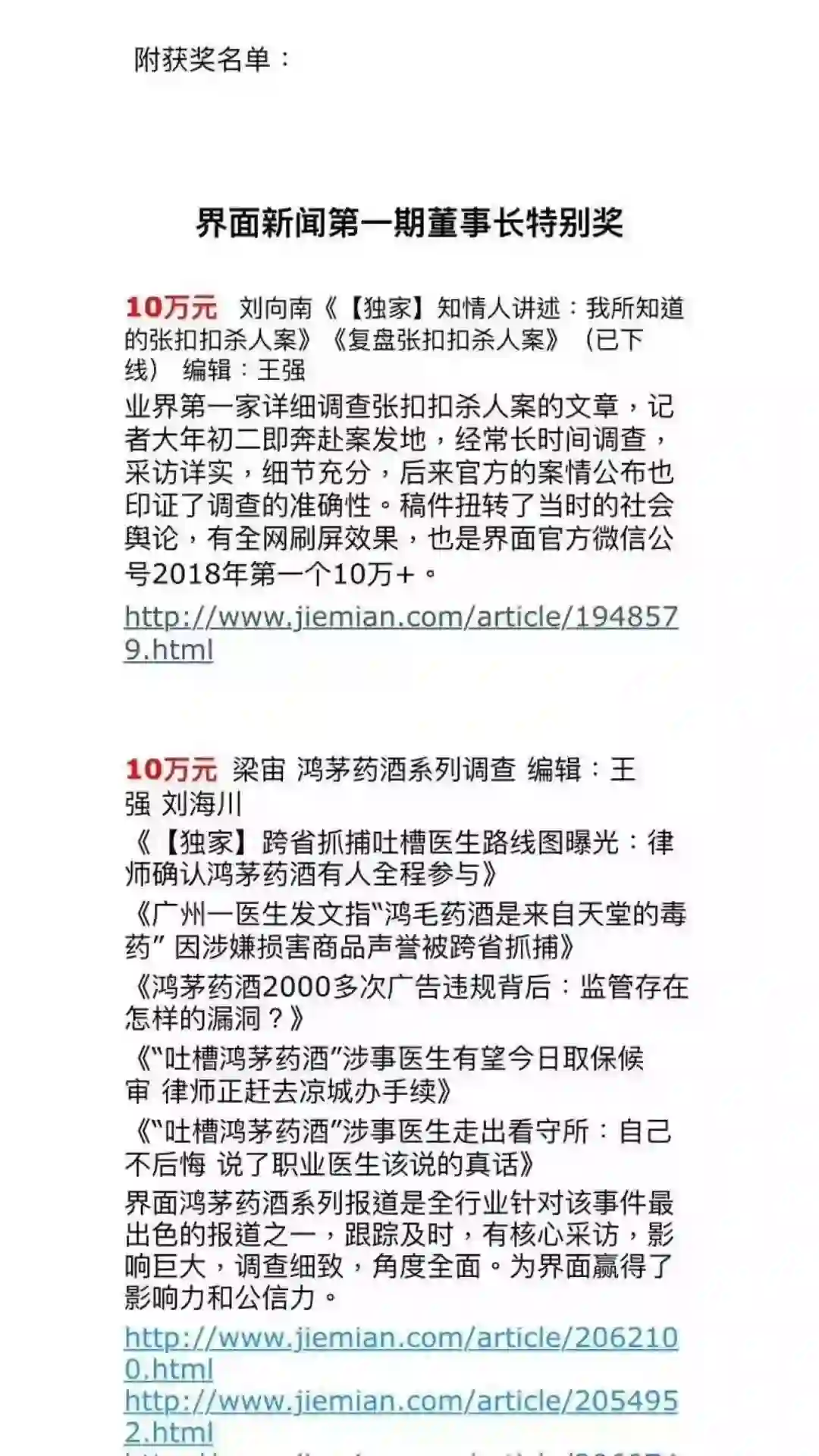 据记者站 昨天,界面·财联社董事长第一期特别奖公示,多组稿件获得10万元奖励,数额之高引发不少业内人士讨论。界面新闻执行总编辑衍阁表示,界面今年准备了1000万奖金,单组(篇)奖励上不封顶。