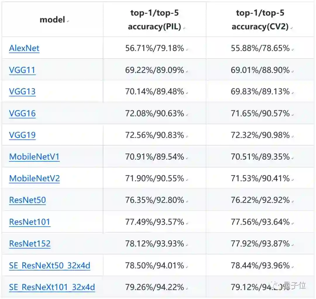得益于深度学习的推动,图像分类的准确率大幅度提升。在经典的数据集ImageNet上,训练图像分类任务常用的模型,包括AlexNet、VGG、GoogLeNet、ResNet、Inception-v4、MobileNet、MobileNetV2、DPN(Dual Path Network)、SE-ResNeXt、ShuffleNet等。