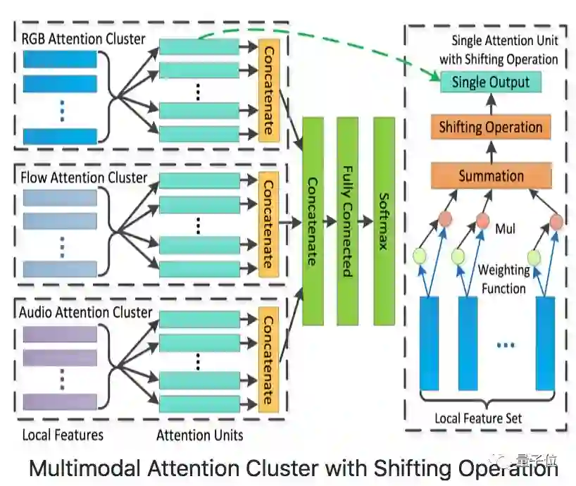 • Attention Cluster模型为ActivityNet Kinetics Challenge 2017中最佳序列模型,通过带Shifting Opeation的Attention Clusters处理已抽取好的RGB、Flow、Audio数据。