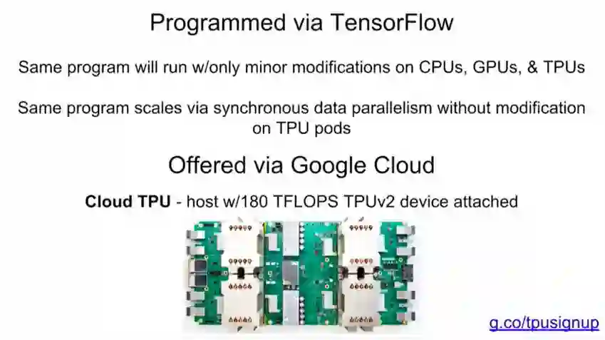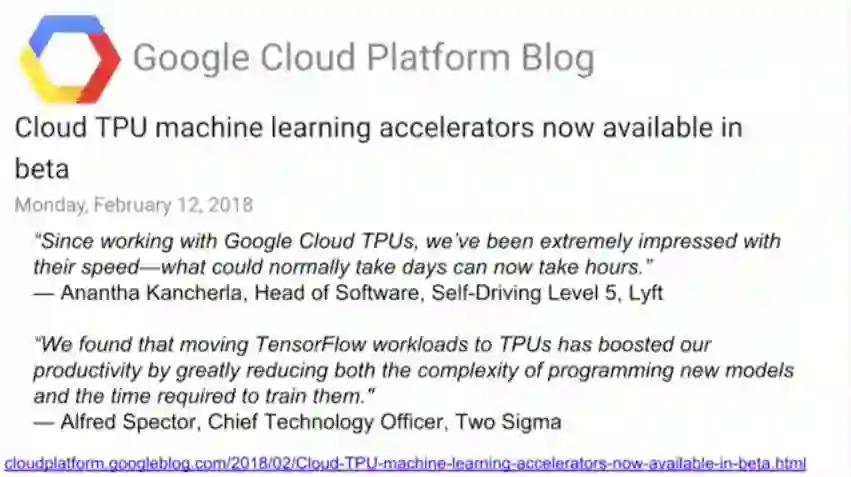 当然,Jeff Dean重点推荐了谷歌刚刚发布不久的Cloud TPU。谷歌设计Cloud TPU是为了给TensorFlow的workload提供差异化性能,并让机器学习工程师和研究人员更快速地进行迭代。
