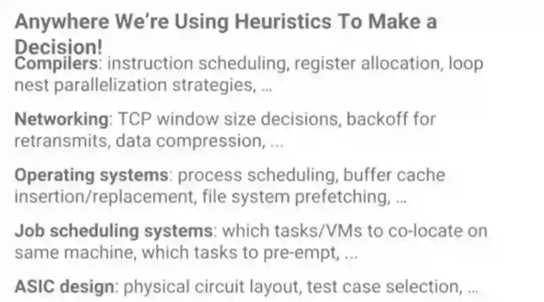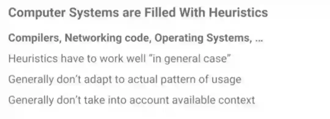 那么,除了数据库,ML还能使用在系统的哪些方面?一个很大的机会是启发式方法。计算机系统里大量应用启发式方法,因此,ML在用到启发式方法的地方,都有机会带来改变。