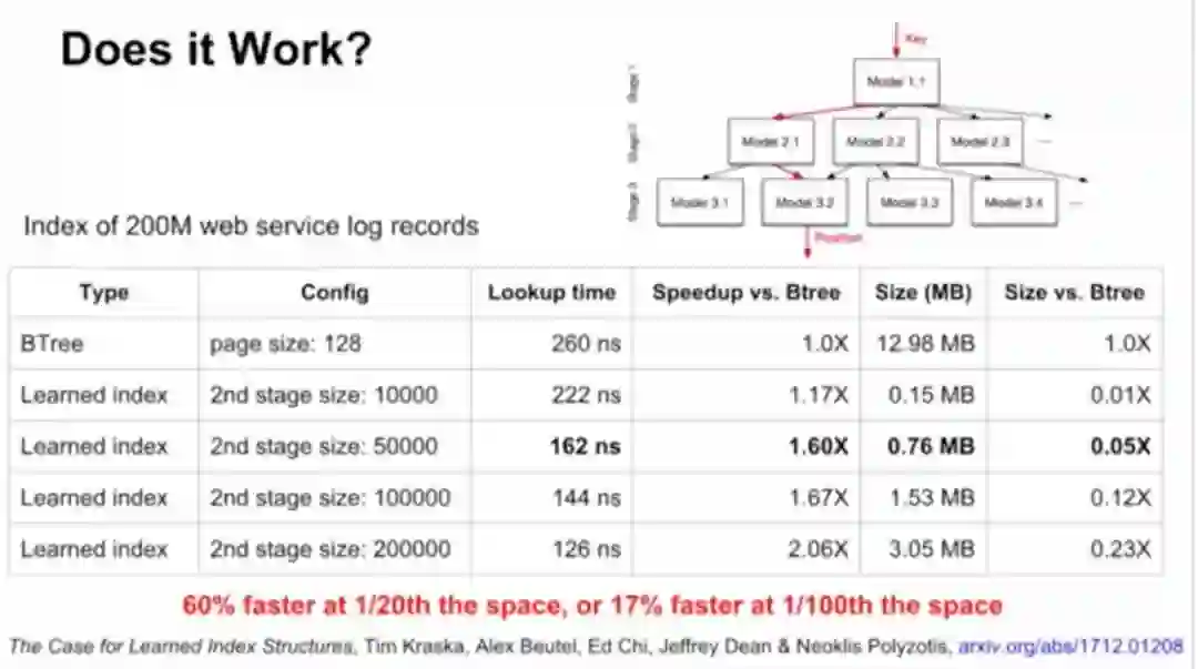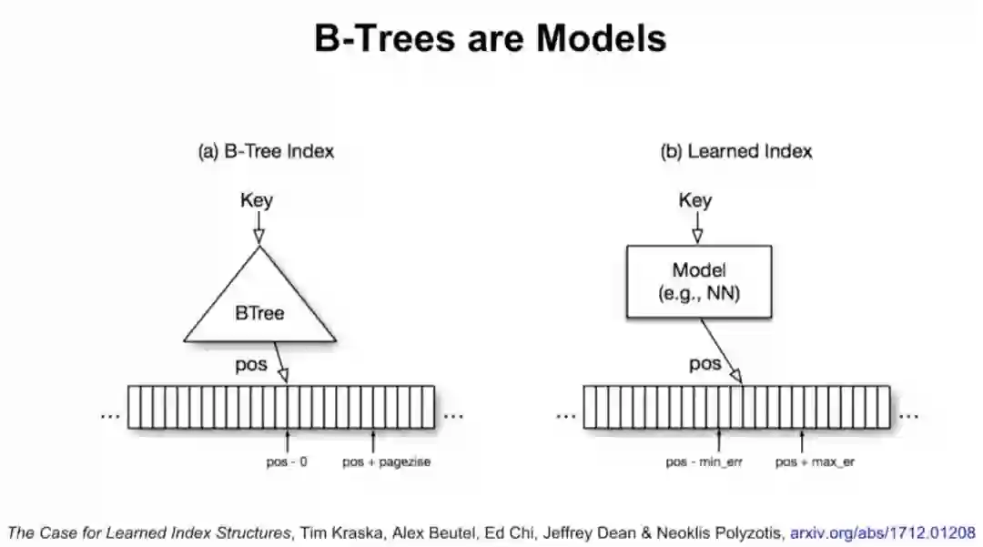 B-tree实际上可以看做模型。数据的累积分布函数(CDF)可以作为索引。举例来说,如果键的范围在0到500m之间,比起用哈希,直接把键当索引速度可能更快。如果知道了数据的累积分布函数(CDF),“CDF*键*记录大小”可能约等于要查找的记录的位置,这一点也适用于其他数据分布的情况。