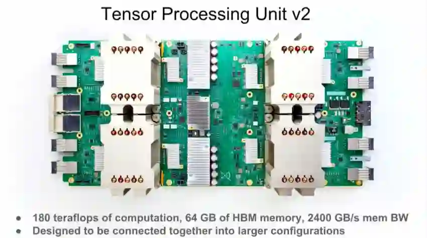 Cloud TPU是谷歌设计的硬件加速器,为加速、拓展特定tensorflow机器学习workload而优化。每个TPU里内置了四个定制ASIC,单块板卡的计算能力达每秒180 teraflops,高带宽内存有64GB。某些程序只会对CPU、GPU、TPU进行微小的修改,某些程序通过同步数据并行度进行缩放,而不能在TPU pod上进行修改。