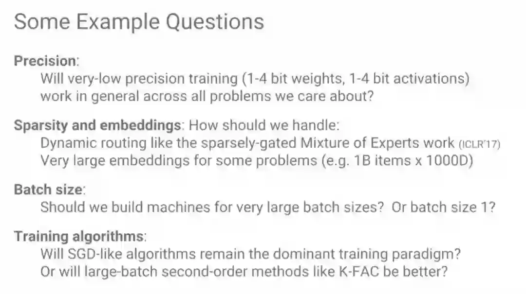 极低精度训练(1-4位权重,1-4位激活)能否适用于通用问题?我们应该如何处理疏密混合的专家路由?如何处理针对某些问题非常巨大的嵌入?我们是否应该专门为处理大的批量建立机器?至于训练算法,SGD一类的算法还会是主流训练范式吗?像K-FAC一类的大批量二阶方法会是更好的选择吗?
