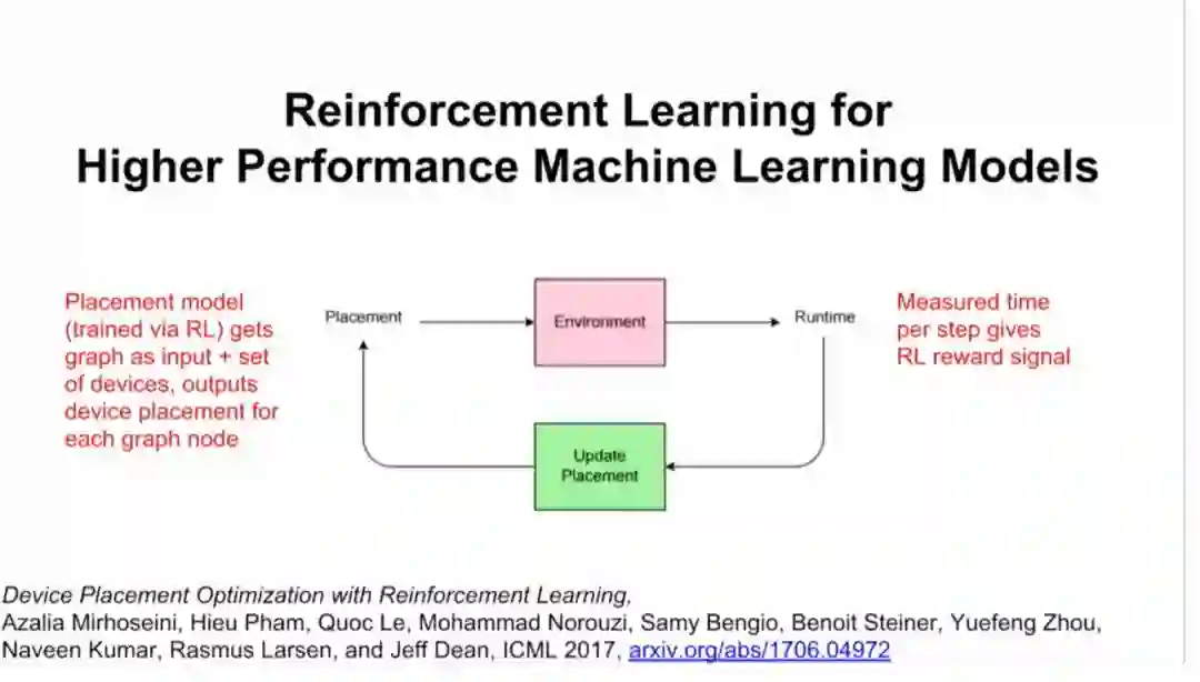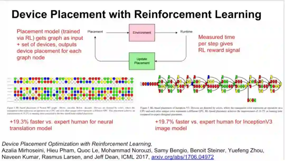 此外,谷歌大脑还在进行一项研究,用强化学习来替代一部分硬件上的计算。你将计算视为算子和dependencies组成的graph,然后给一组硬件,比如你想在4块GPU或者8块GPU上运行这个模型,结果整个过程成了很好的强化学习过程(见下图)。