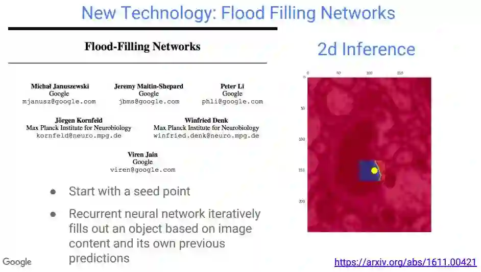 他们还提出了一种模拟生成神经网络的算法“Flood Filling Networks”,可以使用原始数据,利用此前的预测,自动跟踪神经传导。