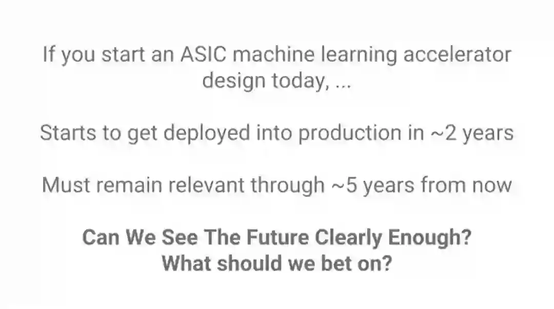 在Arxiv上的机器学习的论文逐年增长,速度已经超过摩尔定律。如果你现在开始做ASIC,大约两年后能够流片,而这款芯片需要能够持续使用3年。换句话说,必须看清楚未来5年的技术发展,但是,我们能够看清吗?怎样看清?