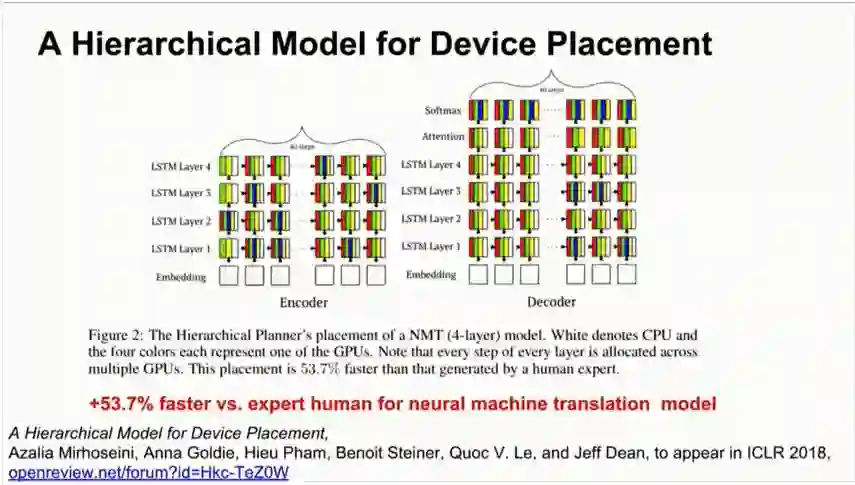 之后,谷歌大脑将上述研究泛化,提出了一个层次模型(Hierarchical Model),将计算图有效地放置到硬件设备上,特别是在混合了CPU,GPU和其他计算设备的异构环境中。这项研究提出了一种方法,叫做“分层规划器”(Hierarchical Planner),能够将目标神经网络的runtime最小化,这里的runtime包括一次前向传播,一次BP,一次参数更新。