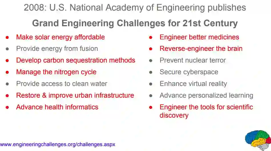 在2008年美国工程院列出的“21世纪重大工程难题”中,14个问题里,至少有8项,也就是一半多,都能用到机器学习,甚至用机器学习去解决,包括环境问题、健康、医药、城市基础设施,以及人脑的逆向工程。