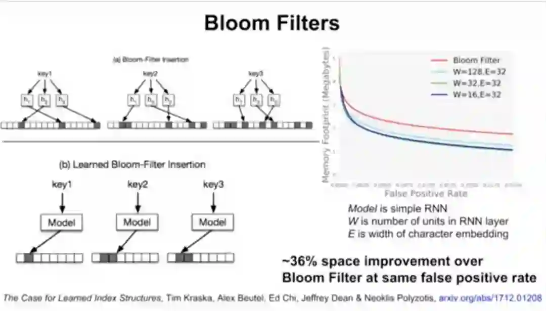 接下来,Jeff Dean介绍了谷歌大脑的研究,用ML模型替代数据库组件。他们将神经网络应用于三种索引类型:B树,用于处理范围查询;哈希映射(Hash-map),用于点查找查询;以及Bloom-filter,用于设置包含检查。