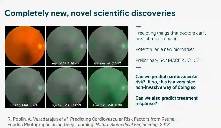 不仅如此,谷歌还使用深度学习视网膜图像分析来预测心血管疾病突发风险。使用深度学习来获得人体解剖学和疾病变化之间的联系,这是人类医生此前完全不知道的诊断和预测方法,不仅能帮助科学家生成更有针对性的假设,还可能代表了科学发现的新方向。
