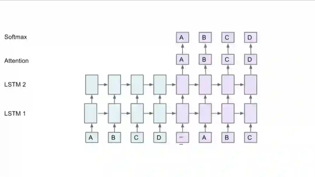 但是,如何将模型分布到不同机器上并且取得好的性能是很难的。Jeff Dean以下面这个网络为例,比如有两个LSTM,有Attention机制,在顶层有Softmax,你可以将方框中的部分放到不同的GPU卡上,因为这些部分都有同样的参数,这些层也不用移动。