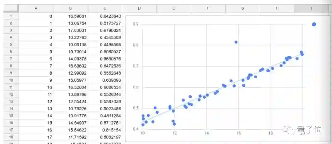 这个.csv文件只有三行,index,distance和force。我在谷歌表格中导入这个文件,创建了带趋势线的散点图,这样就能了解数据的分布情况了。