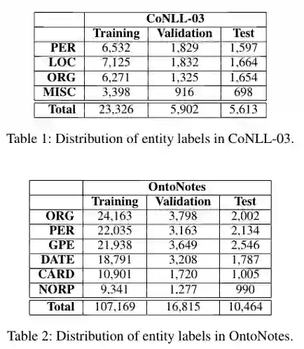 作者采用了2个公开数据集进行实验,分别是CoNLL-03数据集和OntoNotes数据集,见表1和表2。模型的评价指标为准确率、召回率和F1。