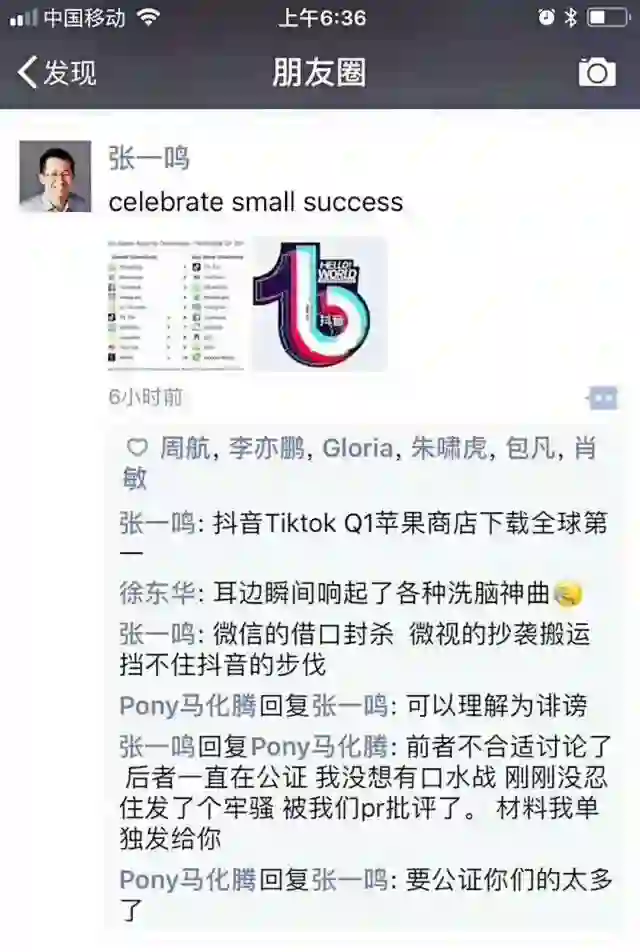 5 月 7 日晚 23 点 57 分,张一鸣在朋友圈谈及抖音的发展时提及微信打压和微视抄袭。在庆祝抖音海外版 TikTok 登顶一季度 App Store 下载榜榜首的消息下,他写道:「微信的借口封杀 微视的抄袭搬运 挡不住抖音的步伐。」马化腾回应张一鸣称其「可以理解为诽谤。」随后,张一鸣表示要单独发马化腾公证的资料。张一鸣暗指腾讯随意打压封杀应用和信息流动,马化腾则称,微信作为平台一视同仁,张一鸣过度敏感了。