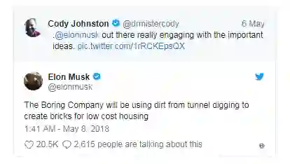 2016 年马斯克成立想在地下挖掘隧道,缓解交通拥堵 Boring 公司。这次马斯克宣布「造砖」是为了响应 YouTube 网红科迪·约翰斯顿的批评。因近日马斯克在 Twitter 上宣布成立一家糖果公司,并补充说,他的计划是「非常严肃的」。对此约翰斯顿贴出了一名 Twitter 用户的评论,这名用户希望马斯克能进军房地产业,为经济困难的人建造可负担的房屋,约翰斯顿评论称,这些人的期望才和「重大创意」相关。(来源:CNET)