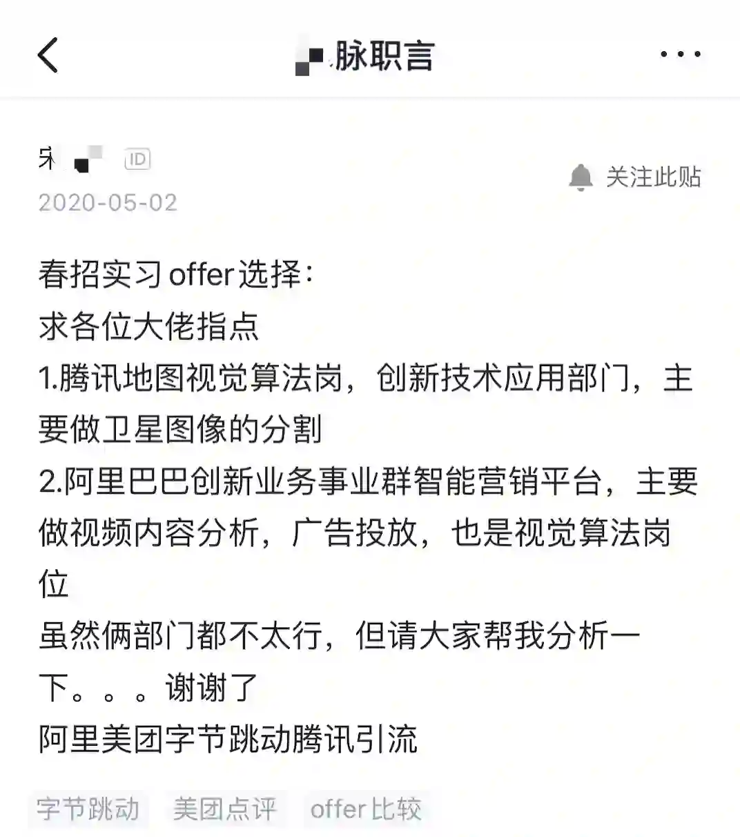 笔者曾在脉脉上看到一条网友求助帖:拿到两个offer,一个腾讯,一个阿里,选哪个?
