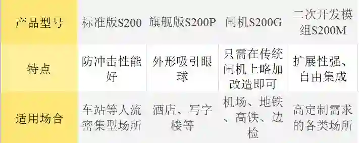 团队研发出“人脸+活体+虹膜”多模态高精度生物特征识别产品。现阶段的产品包括:标准版设备S200、旗舰版设备S200P、闸机S200G和二次开发模组S200M。