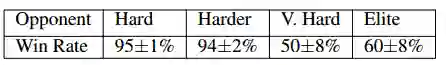 表 4:不同训练过程下和不同难度内建 bot 的最终胜率(3 个种子,每个种子 100 场比赛的平均值)。
