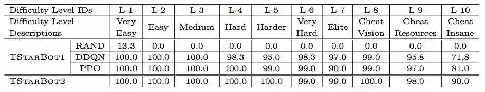 上图是 TStarBots 的评估结果(有战争迷雾)。通过和表 4 对比我们可以发现,智能体在 L-4 到 L-7 级别的虫族对虫族对抗中取得的胜率普遍高于本文的研究。此外,Berkeley 的研究者并没有让智能体和作弊级别(L-8、9、10)的内建 bot 比赛。