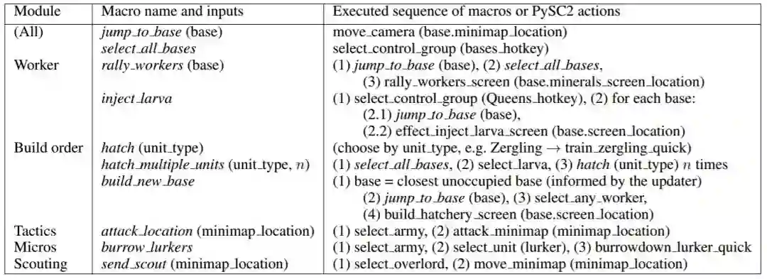 表 2:对每个模块可用的示例宏指令。一个宏指令(斜体字)由宏指令序列或 PySC2 动作构成(非斜体字)。更新者提供 base.minimap location、base.screen location 和 bases hotkey 等信息。
