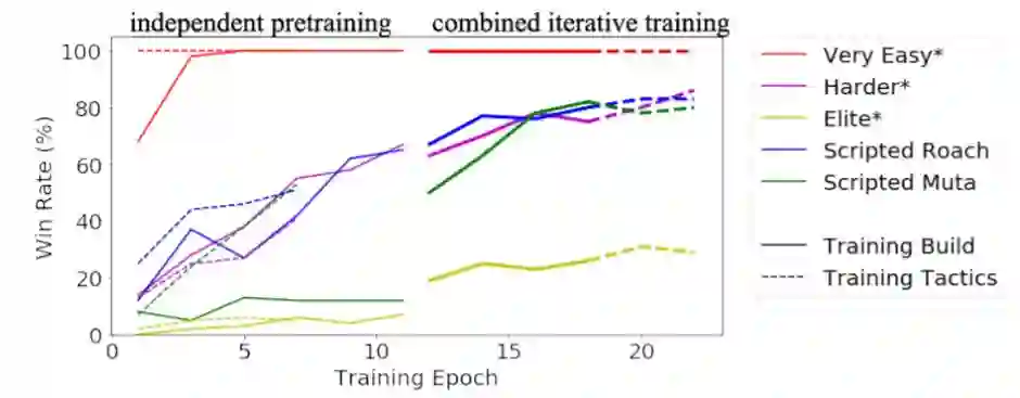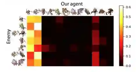 摘要:我们在星际争霸 II 中使用了一种新型模块化 AI 架构。该架构在多个模块之间分割责任,每个模块控制游戏的一个层面,例如建造次序选择或策略。有一个集中策划者会审查所有模块的宏指令,并决定它们的执行顺序。有一个更新者会持续追踪环境变化并将宏指令实例化为一系列可执行动作。该框架的模块可以通过人类设计、规划或强化学习独立地或联合地进行优化。我们应用深度强化学习技术的自我对抗来训练一个模块化智能体六个模块中的两个,在虫族对虫族比赛中对抗"Harder"(level 5)难度的暴雪 bot,达到了 94%(有战争迷雾)或 87%(无战争迷雾)的胜率。
