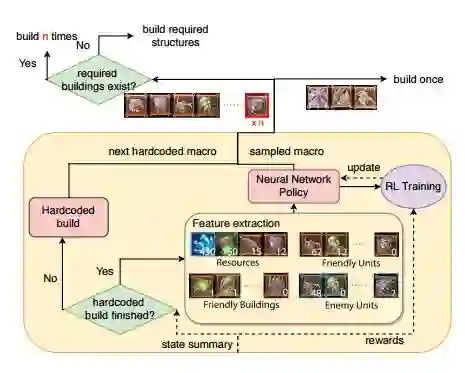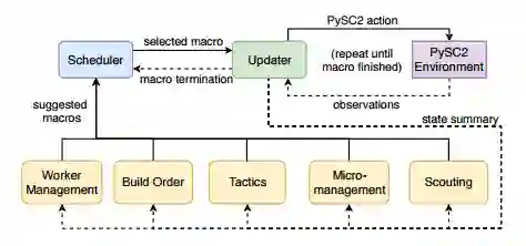 本文研究者认为,适当整合人类知识的深度强化学习可以在不损失策略表达性和性能的前提下有效降低问题的复杂性。为了实现这一目标,他们提出了一种灵活的模块化架构,可以将决策任务分到多个独立的模块中,包括劳工管理、构建顺序、策略、微管理及侦察等(见图 1)。每个模块可以手工设计或通过一个神经网络策略实现,这取决于该任务属于易于手工解决的常规任务,还是需要从数据中进行学习的复杂任务。所有模块向策划者推荐宏指令(预定义的动作序列),策划者决定它们的执行顺序。此外,更新者持续追踪环境信息,适应性地执行由策划者选择的宏指令。