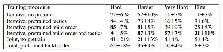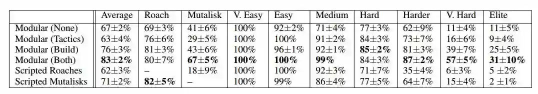 研究者还通过带有自行探索能力的强化学习进一步评估了这一模块化架构,着眼于这个游戏中可以从大量训练经验中获益的重要方面,包括构建顺序和策略。智能体是在 PySC2 环境中训练的(Vinyals et al. 2017),该环境中有个颇具挑战性的类人控制接口。研究者采用了一种迭代训练方法,首先训练一个模块,同时其他模块遵循非常简单的脚本化行为,然后用一个神经网络策略替换另一个模块的脚本化组成,在之前训练的模块保持固定的情况下继续训练。研究者评估智能体玩虫族 v.s. 虫族对抗梯形图上的内建 bot,在对抗「Harder」bot 时取得了 94%(有战争迷雾)或 87%(无战争迷雾)的胜率。此外,该方法的智能体在延伸测试图中泛化良好,并且取得了类似的性能。