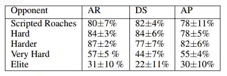 表 5:和不同对手的胜率对比(100 场比赛)。括号里写的是预训练部分。「V」表示「非常」。从表中可以看出,我们的方法能超越简单的脚本智能体。