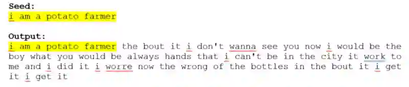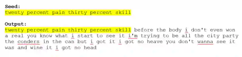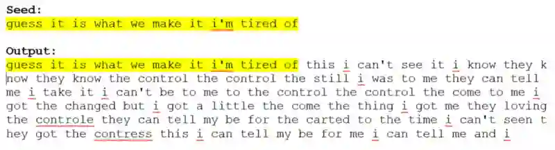 训练网络之后,我们将使用某个随机种子(用户输入的字符串)作为输入,让网络预测下一个字符。我们将重复这一过程,直到创建了足够多的新行。