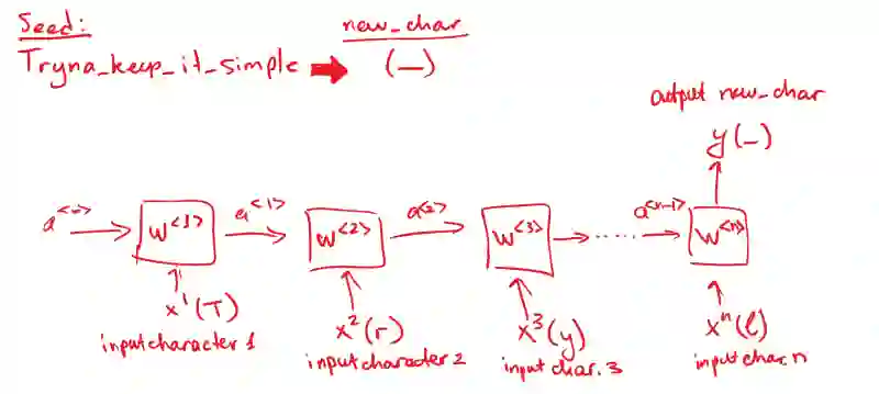 字符层次模型的输入是一系列字符seed(种子),模型负责预测下一个字符new_char。接着使用seed + new_char生成下一个字符,以此类推。注意,由于网络输入必须保持同一形状,在每一次迭代中,实际上我们将从种子丢弃一个字符。下面是一个简单的可视化: