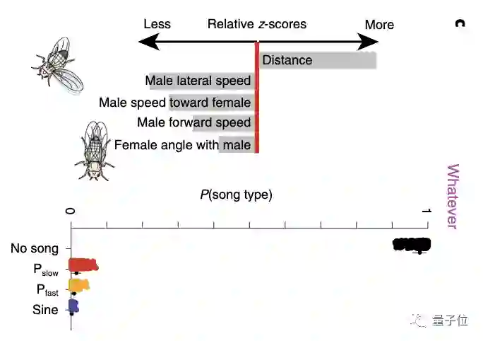 第三种状态,称为不感兴趣(Whatever)。雄蝇与雌蝇的平均距离较远,雄蝇移动缓慢且朝向远离雌蝇的方向。
