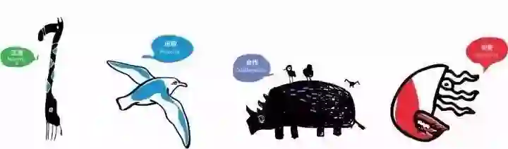 长颈鹿(正直)、海燕(进取)、犀牛与犀牛鸟(合作)、鹦鹉螺(创新)