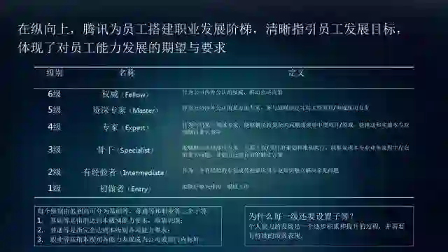 另外,这个荣誉升级体系为腾讯带来了一个非常好的补充。因为腾讯的组织划分是偏非职能化的,每一个团队或者说每一个业务 部门都是一个完整的独立单元,可以独自作战,是一个典型的强矩阵模式。这种运营模式往往会让企业忽略员工的成长,而这个荣誉升级体系刚好在这方面给到了一 个很好的补充。