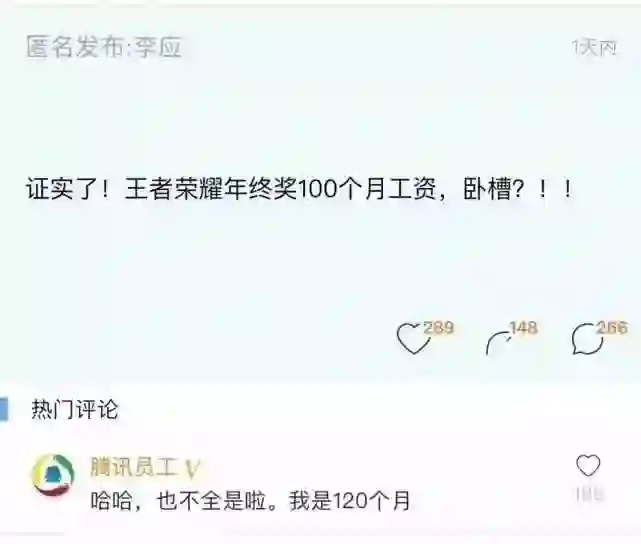 前不久脉脉匿名区有人爆料,腾讯旗下人气手游《王者荣耀》团队的年终奖有100个月工资。随后还有腾讯员工证实,“没有啦,也不全是,大部分是120个月,最低的100个月······”