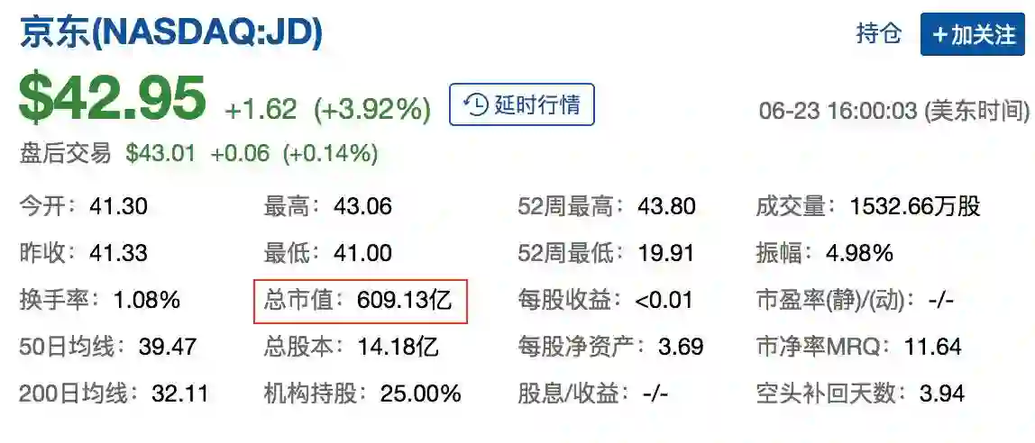 截至发稿前,京东总市值为609.13亿美元,直逼百度的615.7亿美元。