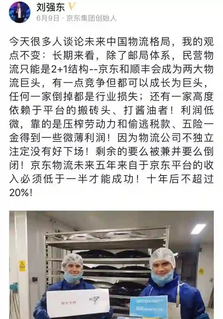 6月9日,刘强东发布了一则消息,在谈论未来中国物流格局时,他表示,“除了邮局体系,民营物流只能是2+1结构——京东和顺丰会成为两大物流巨头。有一点竞争但都可以成长为巨头,任何一家倒掉都是行业损失”。