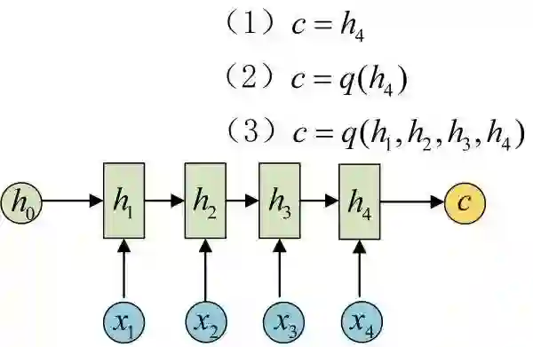 得到c有多种方式,最简单的方法就是把Encoder的最后一个隐状态赋值给c,还可以对最后的隐状态做一个变换得到c,也可以对所有的隐状态做变换。