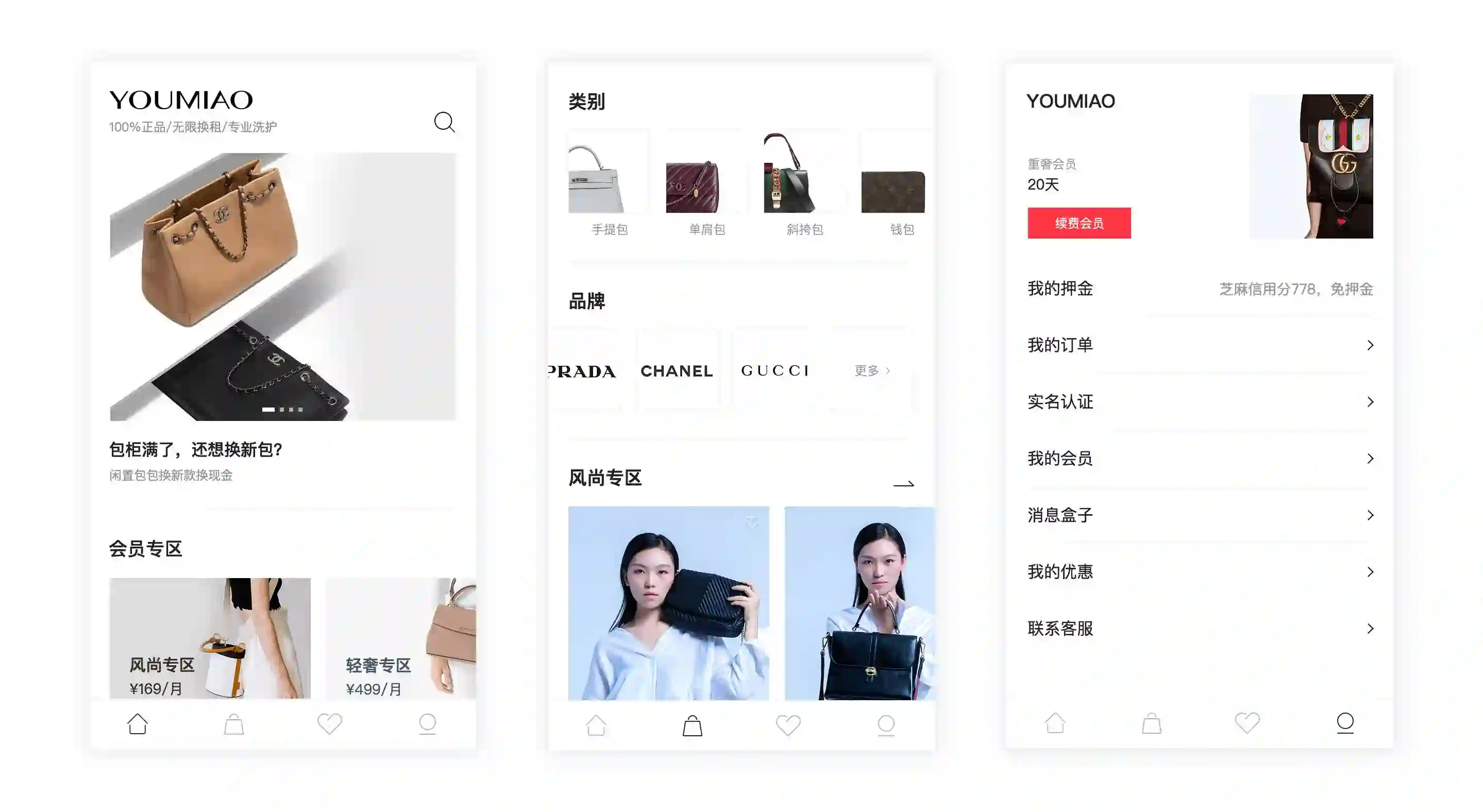 用户可以通过关注微信服务号或者下载App,实现浏览、租赁、购买、回收、鉴定、洗护等专业服务。只需按月支付数百元不等,成为会员,会员期内即可无限换租对应专区的包包。也可以将闲置的包包回收到有喵的共享包包池里重新开始流通,用户可通过旧包回收换取会员资格。