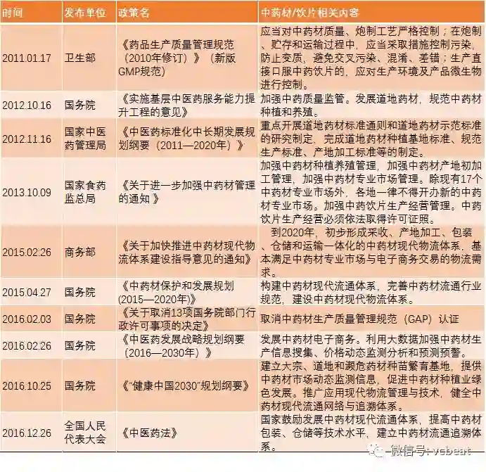 法规方面,《“健康中国2030”规划纲要》指出,要建立大宗、道地和濒危药材种苗繁育基地,提供中药材市场动态监测信息,促进中药材种植业绿色发展。推广应用现代物流管理与技术,健全中药材现代流通网络与追溯体系。
