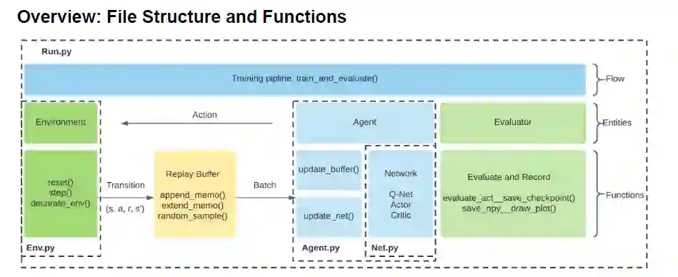 图中Agent.py中的智能体使用Net.py中的网络,并且通过与Env.py中的环境进行交互在Run.py中进行了训练。