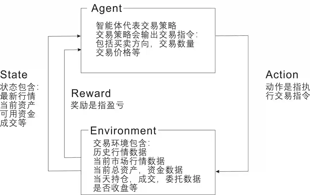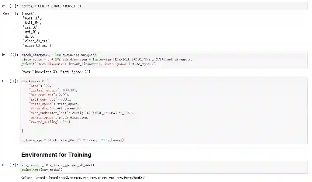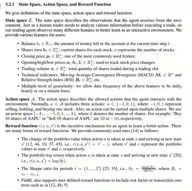 最后,FinRL的成功得益于对环境的定义, FinRL量化交易环境中:状态空间、动作空间和奖励函数的定义。