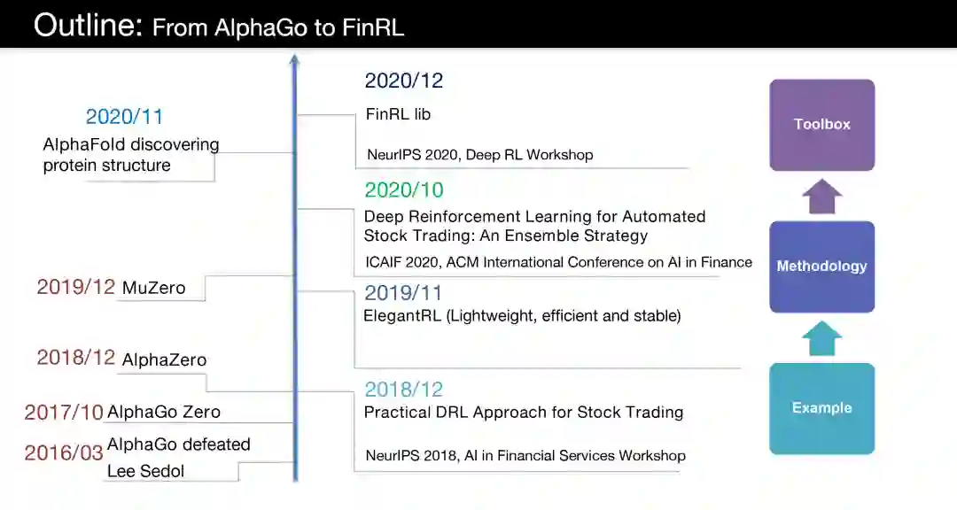 这还得从强化学习的发展说起,下图是该团队汇总的强化学习到FinRL的发展过程,其中FinRL中包含了很多现有的强化学习算法的描述和实现。