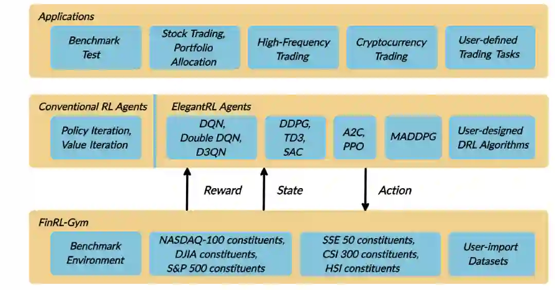 前文解释了FinRL的组成部分,状态定义等内容,下图为大家呈现FinRL框架的实现整体包含了环境(FinRL-Gym)、算法和应用三部分,如下图所示: